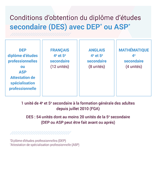 Vous n’avez pas encore votre diplôme d’études secondaires (DES) ou vous souhaitez obtenir une qualification reconnue(AEP, ASP, CFMS, DEP, AEC, DEC)? Les conseiller(ière)s vous guident dans les démarches pour atteindre cet objectif, en tenant compte de vos acquis et de vos besoins.